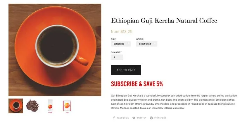It turns out that while Squarespace does indeed have a subscription service, it is limited in functionality and customization. We found a host of 3rd party apps that could be integrated into Squarespace but unless you paid $50+ you would be limited to their basic customization. We decided to use to Squarespace's own subscription service but to add numerous variables for each product including Size, Grind, Quantity to match what they were looking for.. While this was a bit time consuming, it allowed for visitors to easily guide between single purchase and subscription pages for each product.